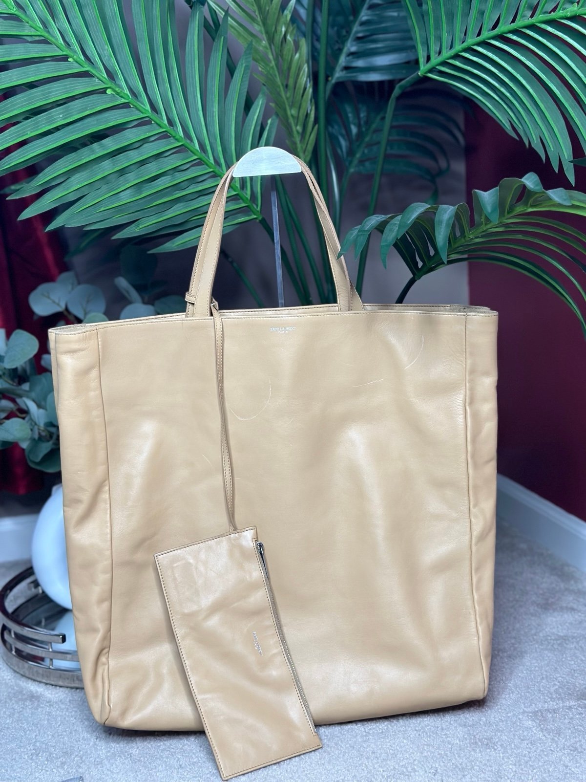 Elevate your accessory collection with the Saint Laurent Reversible Oversized Tote Bag, a testament to the brand's commitment to luxury and style. Crafted from premium leather, this tote presents a versatile beige exterior that effortlessly switches up your look. The spacious interior, lined with exquisite leather, provides ample room for your essentials, making it an ideal choice for both everyday use and special occasions. Attention to detail is evident in the durable leather handle and strap, ensuring comfort and longevity. This sophisticated piece is accompanied by a matching pouch and dust bag, ensuring your tote remains pristine and organized. The reversible design offers a unique touch to the classic tote style, making it a standout addition to any ensemble.