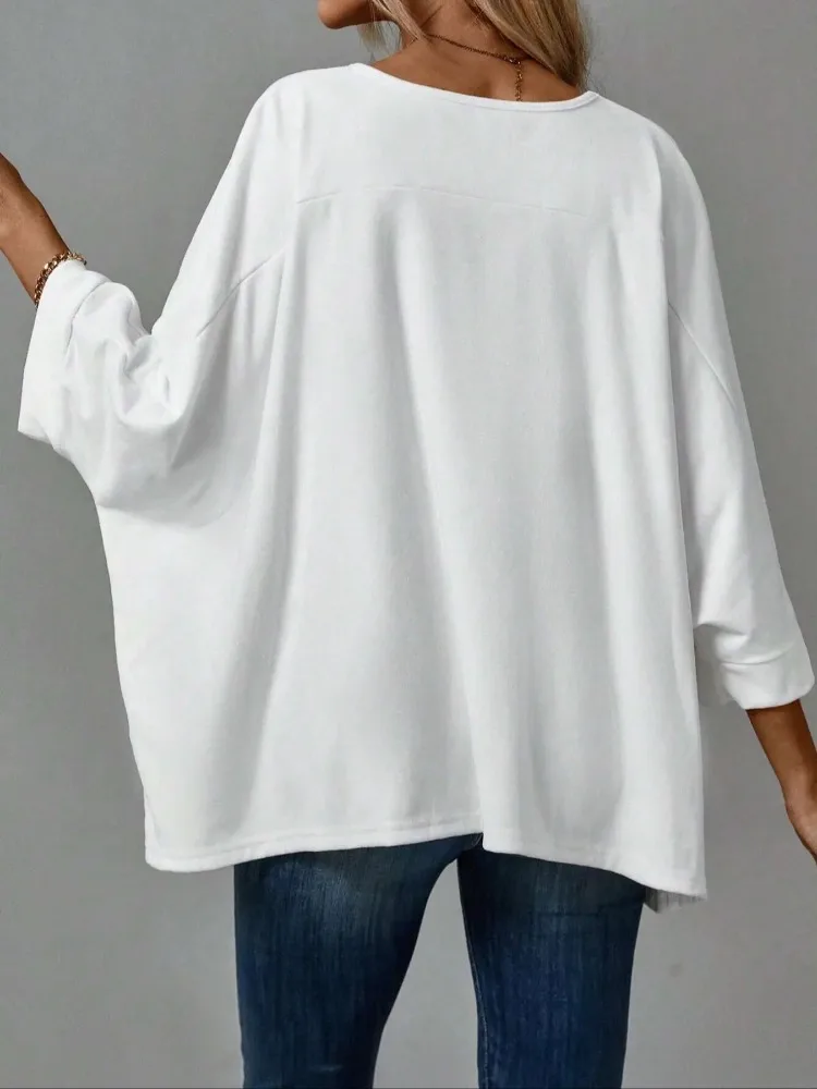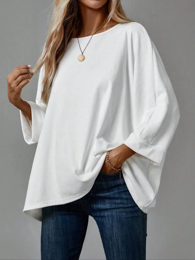 Women's Spring New Versatile Solid Color Long Sleeved T-shirt Casual Round Neck Top Fashion Bat Sleeve Design Top